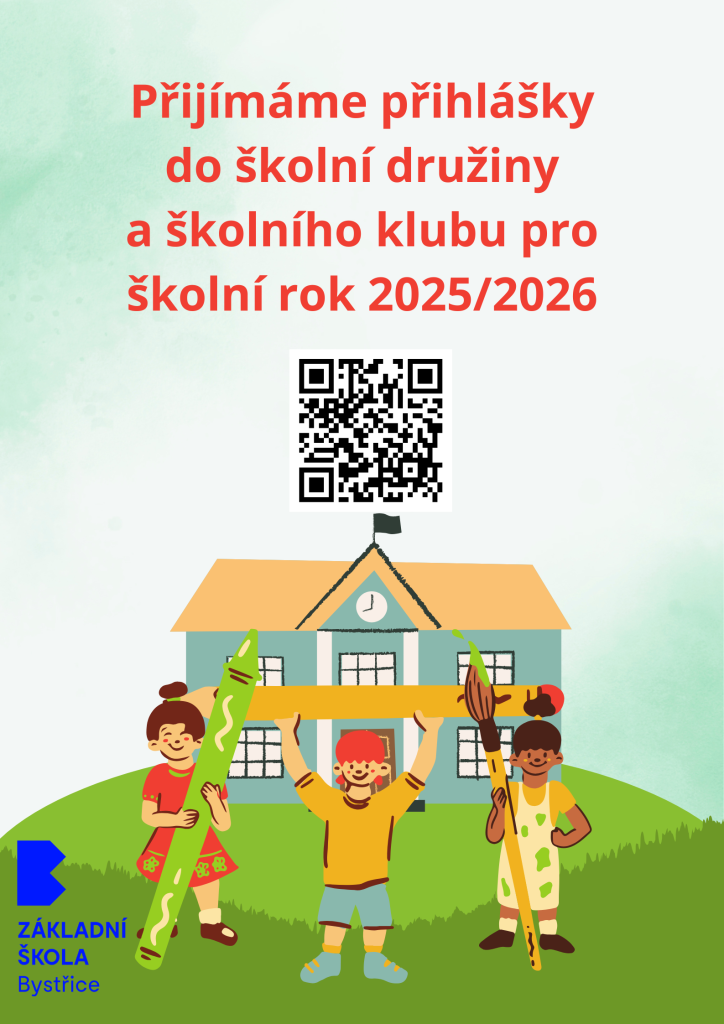 do 30. 6. 2025 můžete své děti přihlašovat k zájmovému vzdělávání ve školní družině a školním klubu pro příští školní rok pomocí elektronického formuláře na https://forms.gle/TcXrrgaUVD8Fqmb78 (můžete využít také QR kód na přiloženém obrázku).