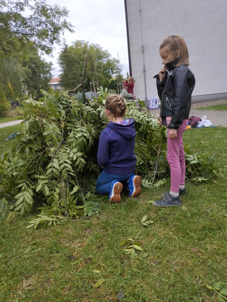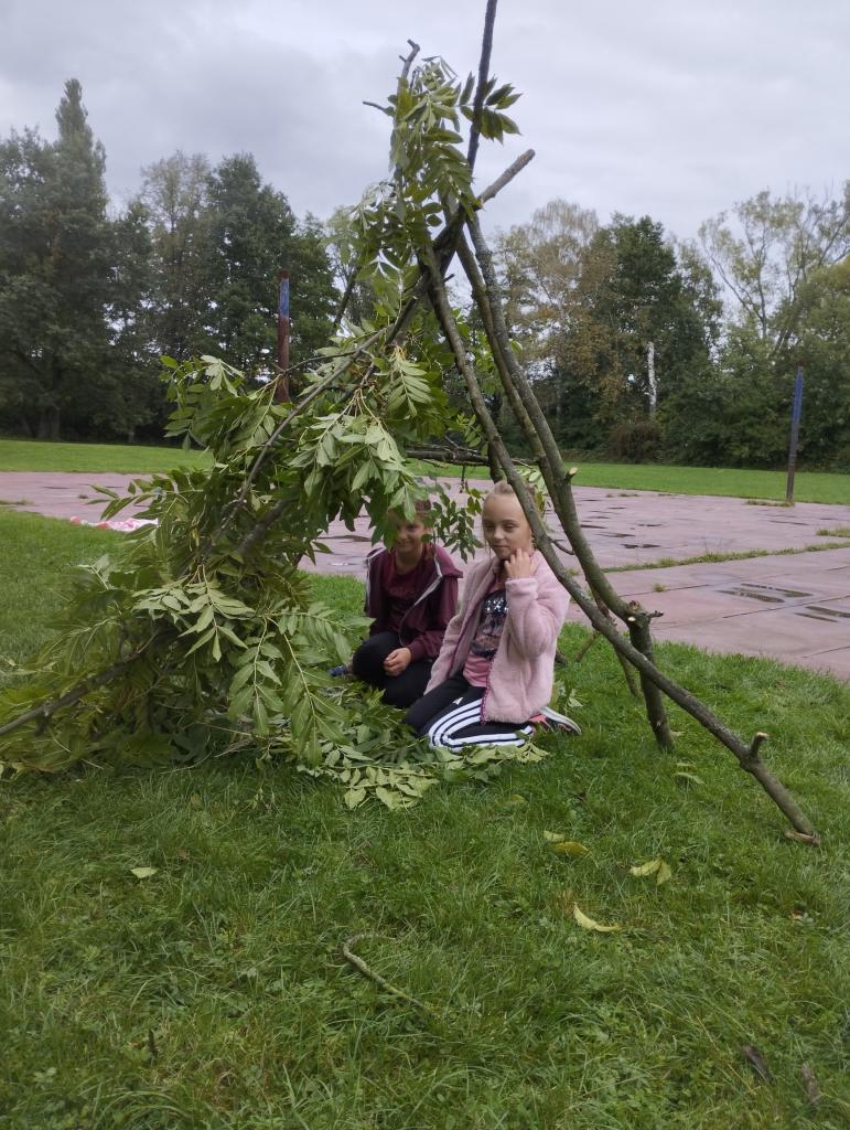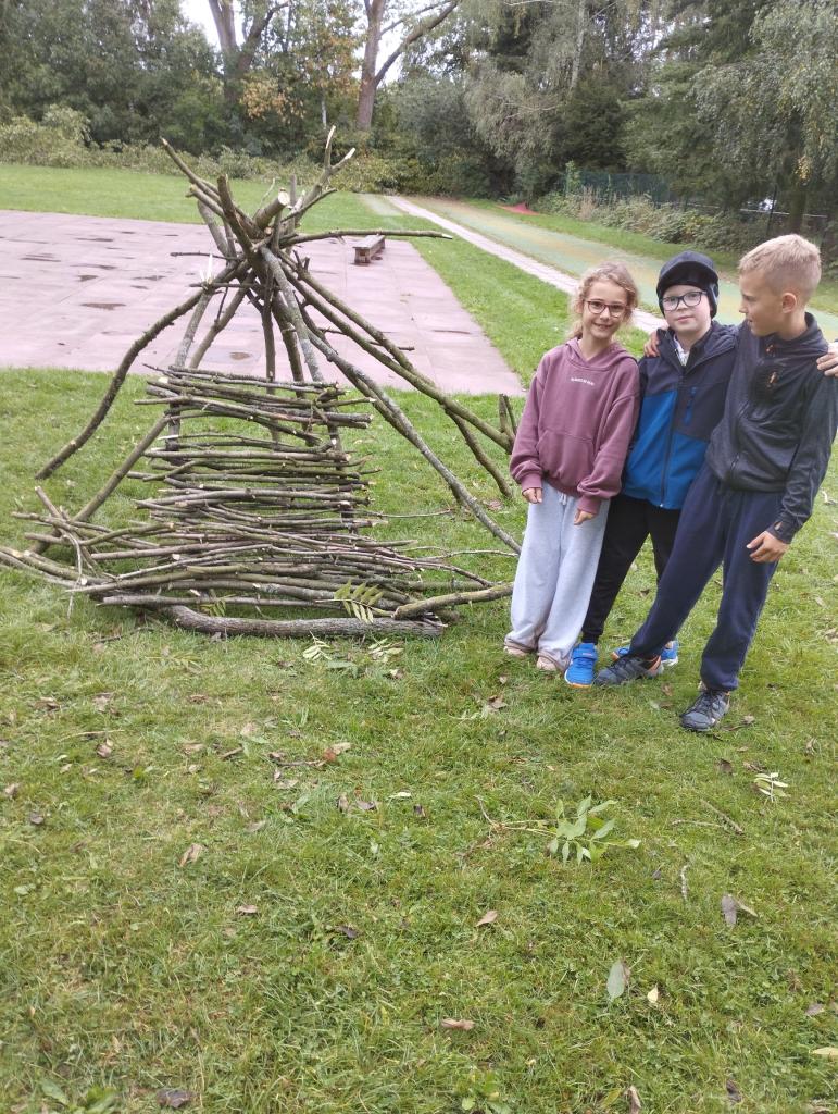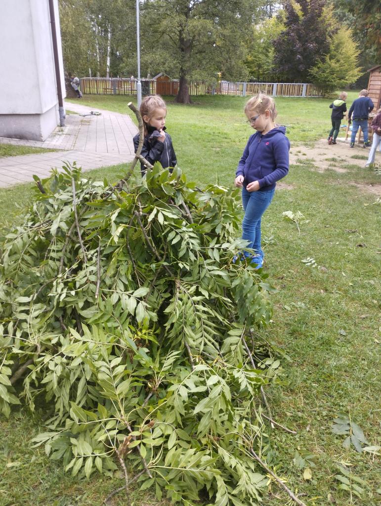 V září v družině pracujeme na stavbě chýší z větví po prořezání okolních stromů.