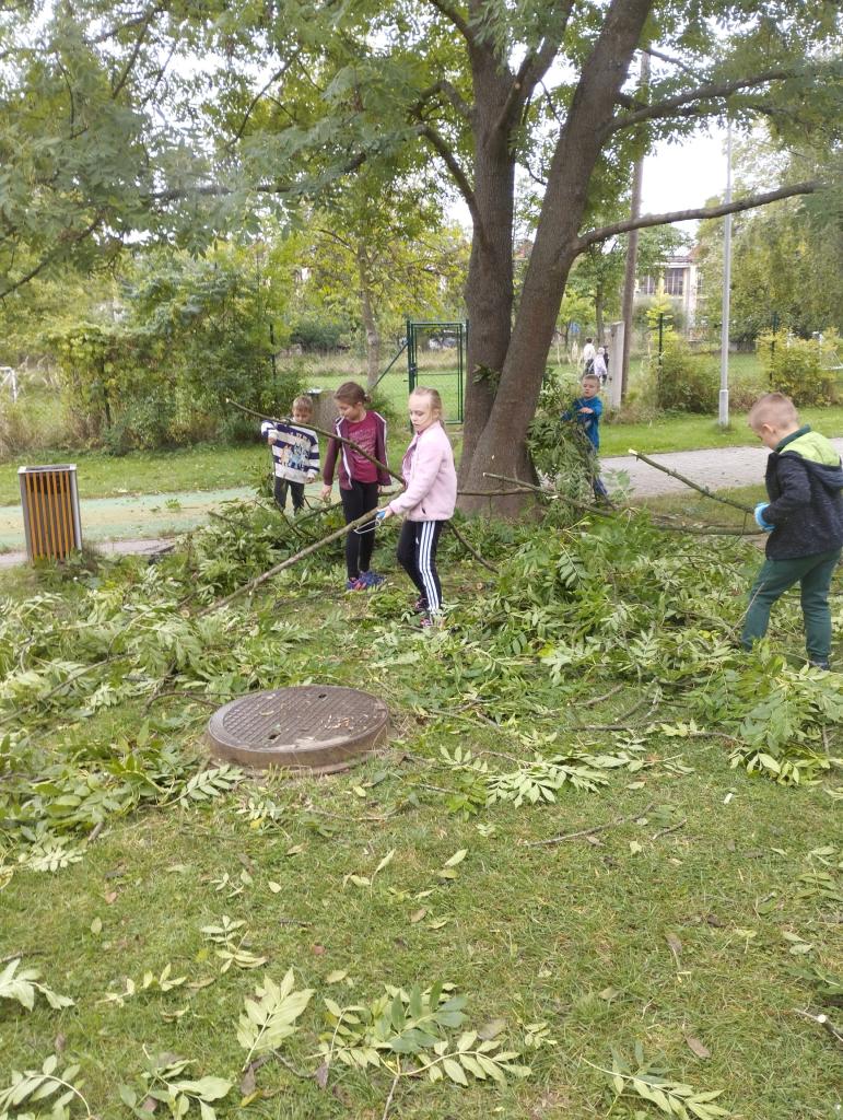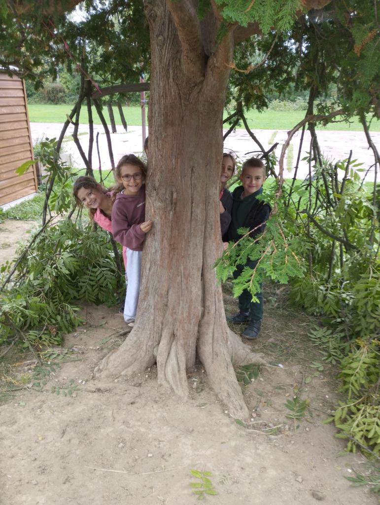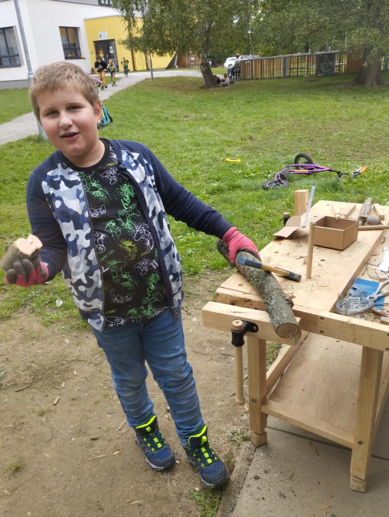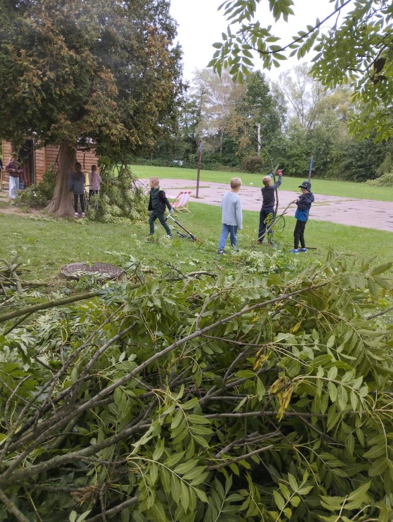 V září v družině pracujeme na stavbě chýší z větví po prořezání okolních stromů.